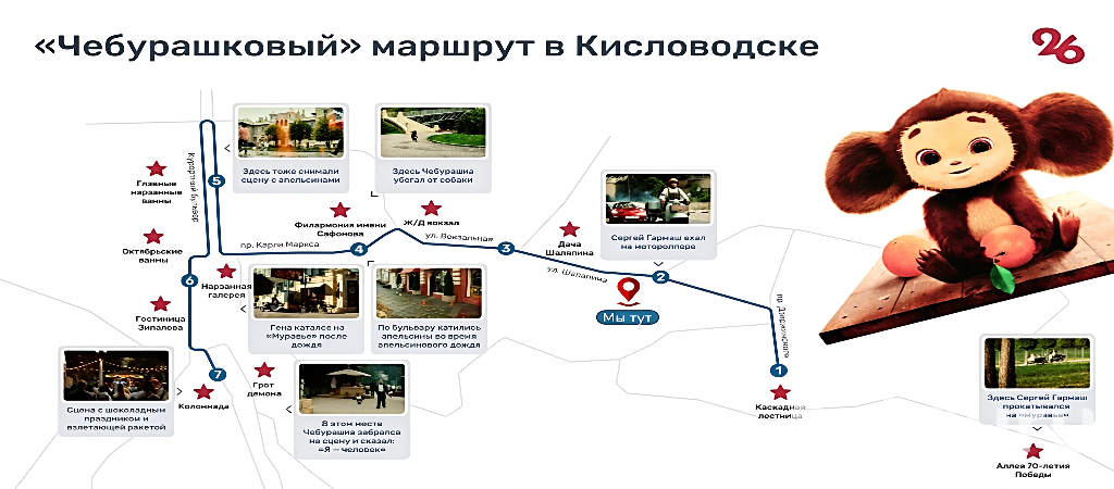 Пациенты лечебно-реабилитационного клинического центра "Курортная больница" имеют уникальную возможность оказываться в самом сердце полюбившегося зрителям мульфильма про Чебурашку! Прямо рядом с ЛРКЦ проходит настоящий сказочный маршрут на котром находится места маста из полюбившегося зрителям фильма. Проследовав по нему можно ощутить ту самую атмосферу радости и волшебства, которую подарило кино, посетить место, где пролился легендарный апельсиновый дождь и другие места, где снимали самые добрые сцены фильма, а также сделать фото у памятника Чебурашке, который стал новым символом Кисловодска!